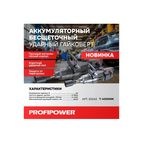 Аккумуляторный бесщеточный ударный гайковерт PROFIPOWER T-4000NK короткий шпиндель E0243